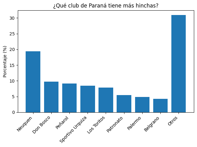 La pasión por el fútbol local sigue reflejada en encuesta vigente, realizada entre seguidores del fútbol de Paraná, donde se consultó qué club cuenta con mayor cantidad de hinchas en la ciudad. Los resultados muestran un escenario competitivo, con varios clubes históricos concentrando gran parte de las preferencias y una base muy amplia de instituciones que siguen creciendo en acompañamiento.